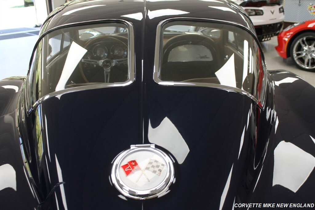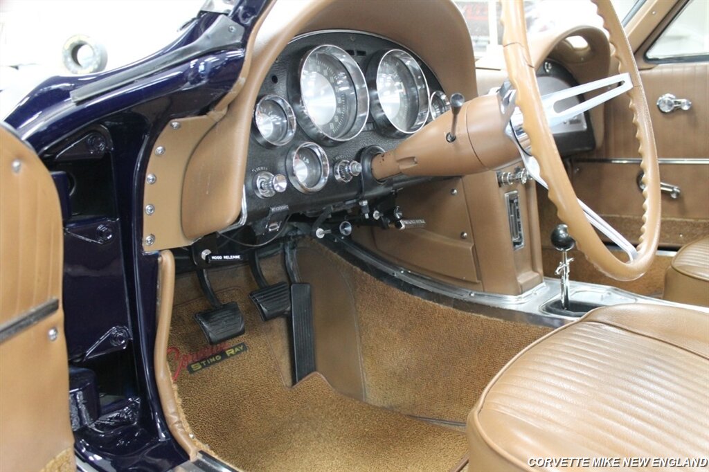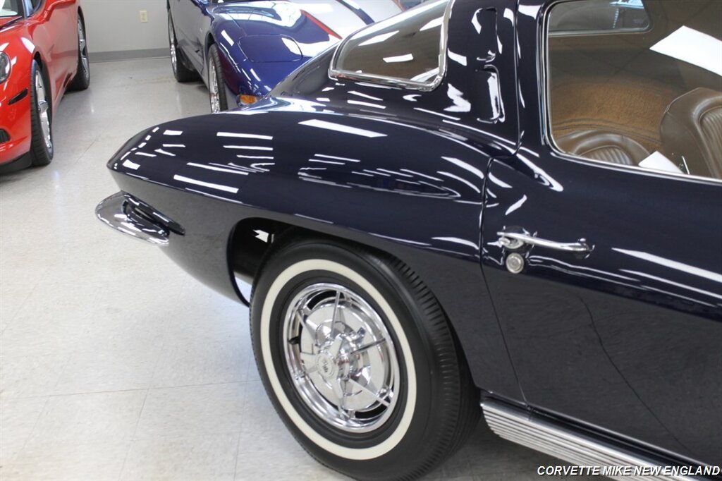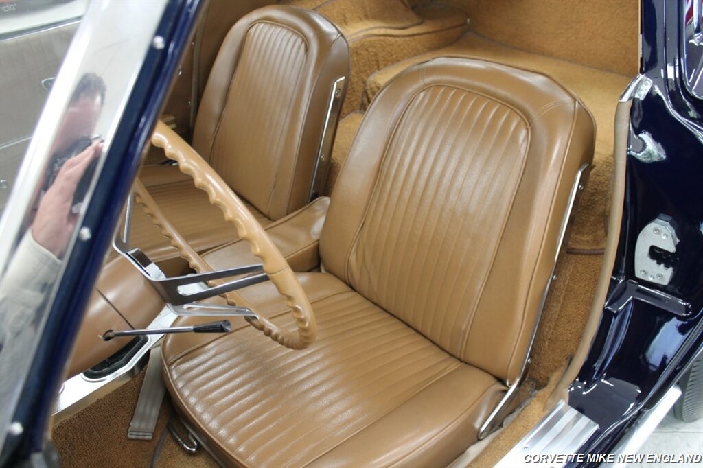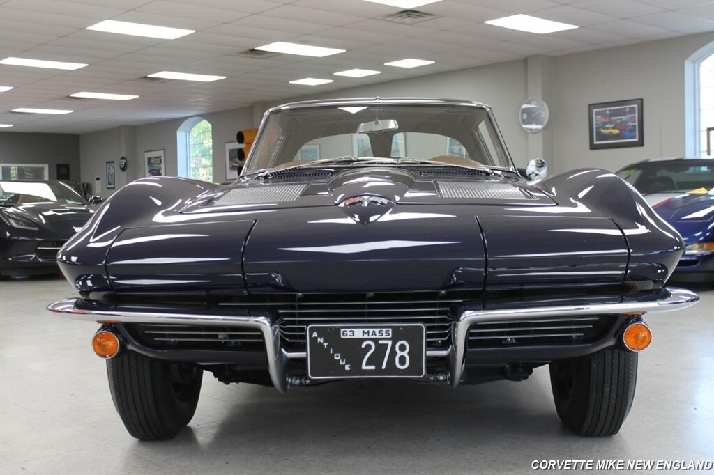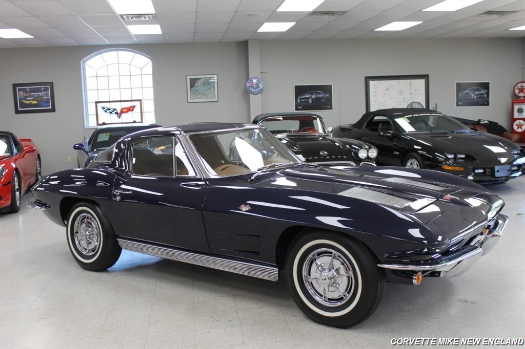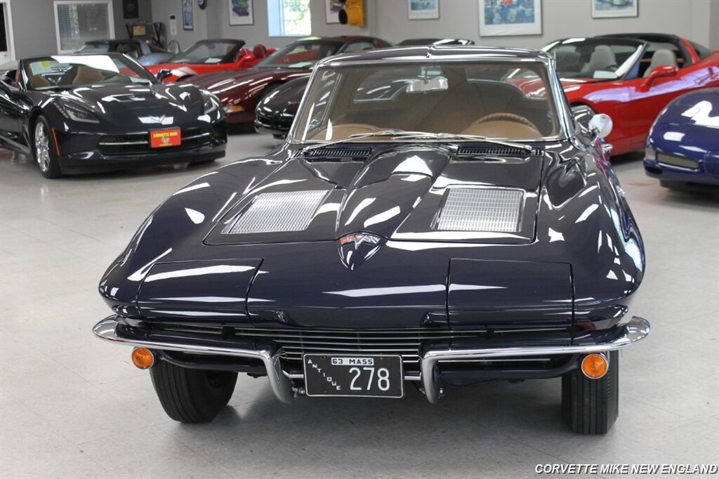 1963 Corvette Coupe, One of 3,475 Daytona Blue split window coupes, Original like new Saddle interior with leather seats ( one of only 1,114 with leather seats), Matching number original L75 327ci 300HP V8 engine, M20 4-spd automatic transmission, Three-bar spinner wheels with B.F. Goodrich Silvertown white wall repro tires, Upgraded retro AM/FM radio, Complete no expense spared frame off restoration with spectacular paint, chrome, and undercarriage with an unbelievable like new original interior......Call for price!!!
