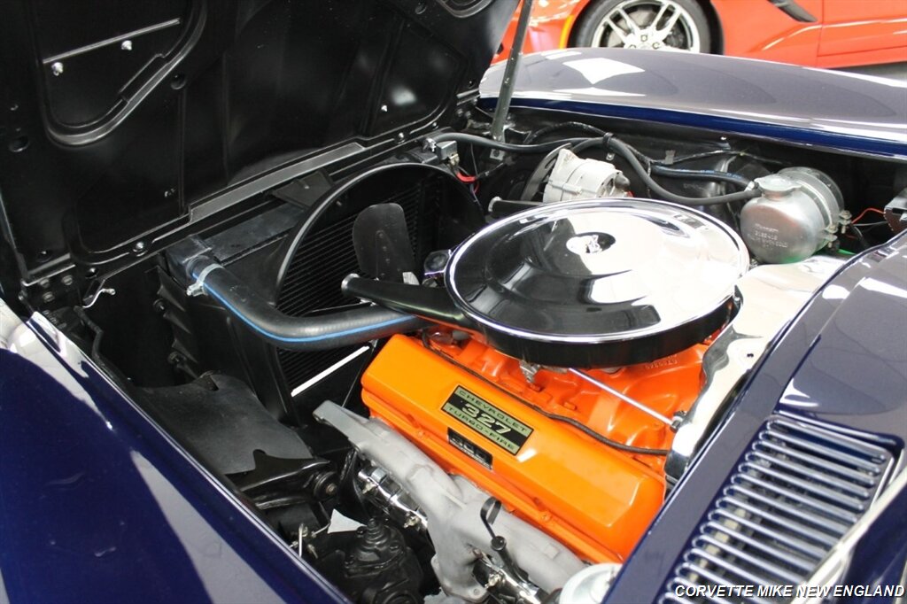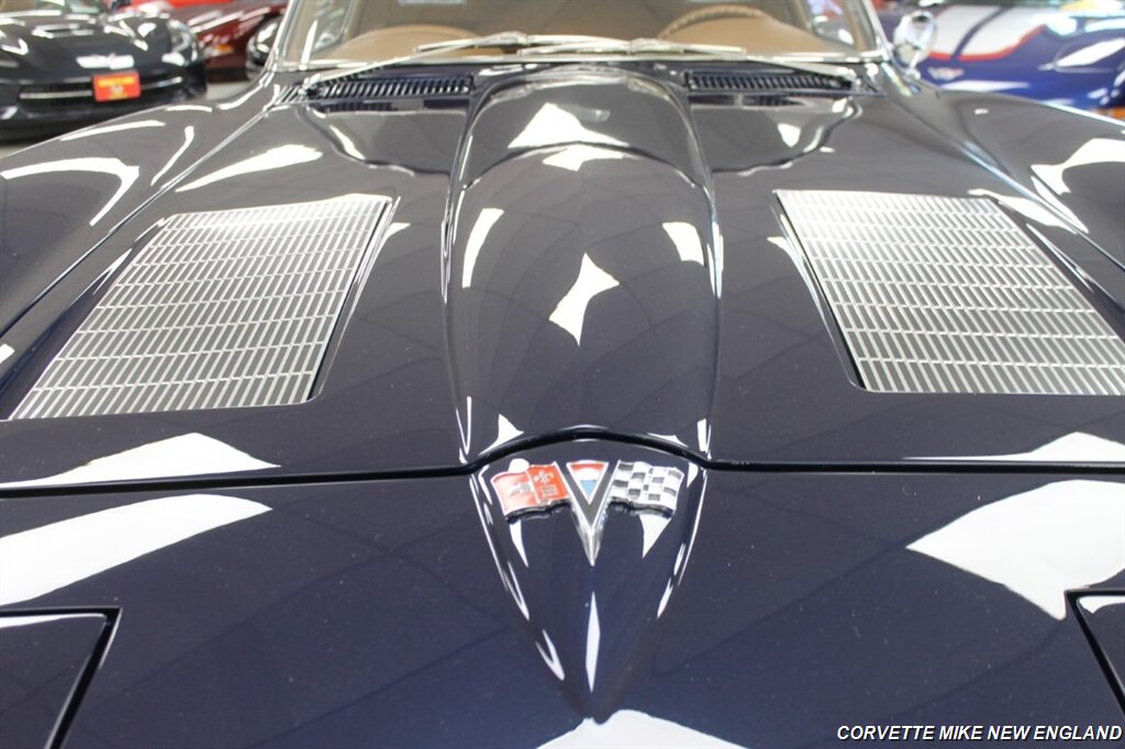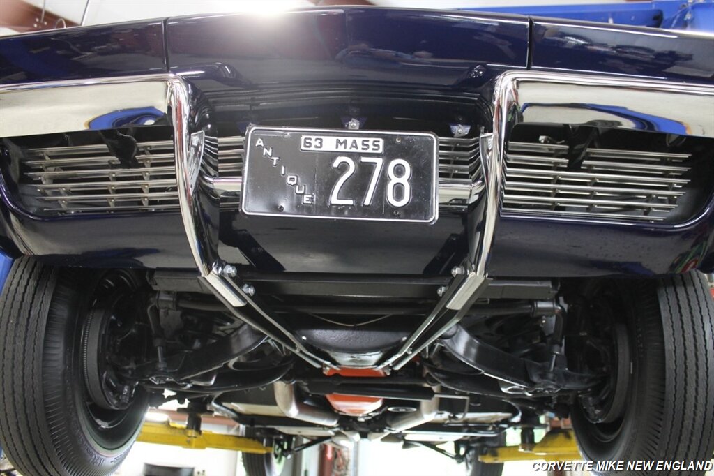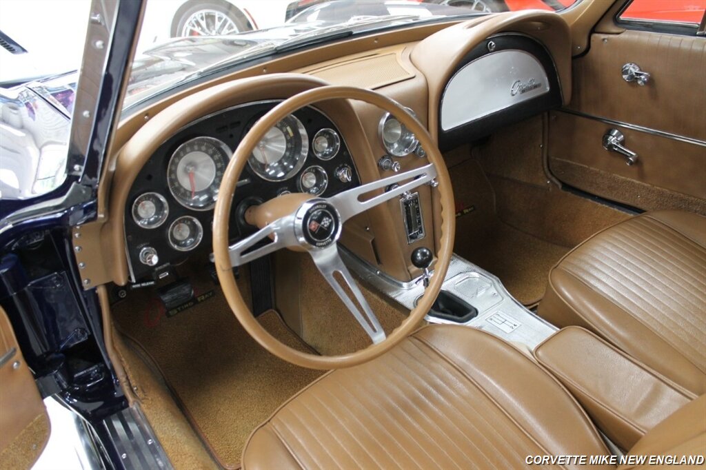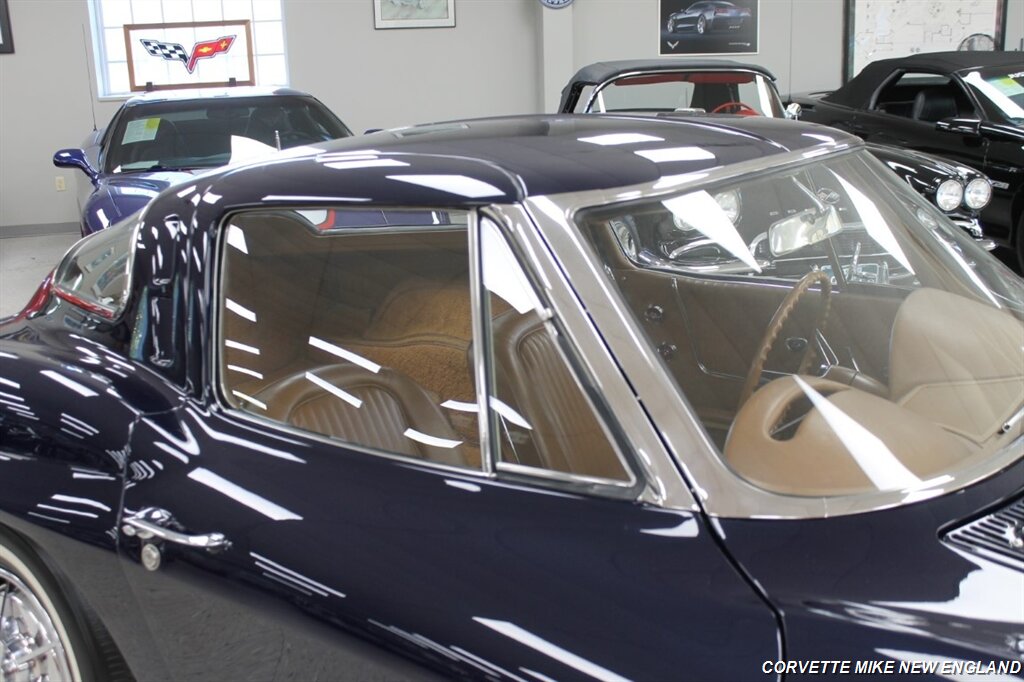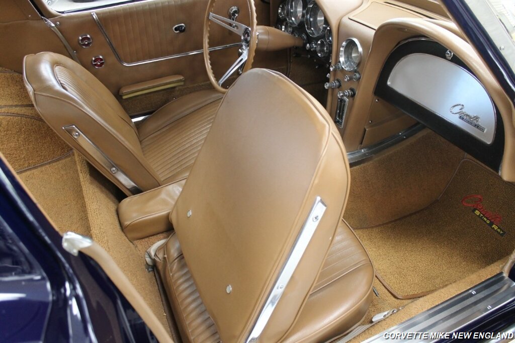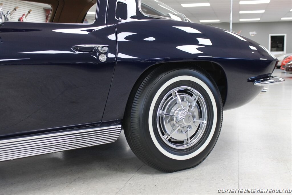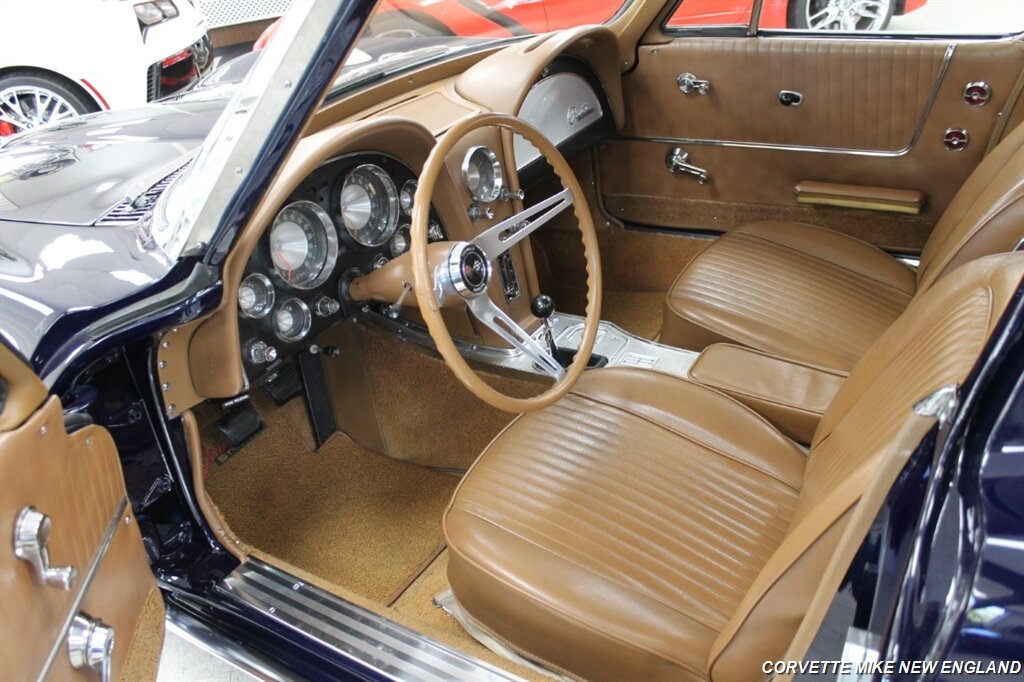 1963 Corvette Coupe, One of 3,475 Daytona Blue split window coupes, Original like new Saddle interior with leather seats ( one of only 1,114 with leather seats), Matching number original L75 327ci 300HP V8 engine, M20 4-spd automatic transmission, Three-bar spinner wheels with B.F. Goodrich Silvertown white wall repro tires, Upgraded retro AM/FM radio, Complete no expense spared frame off restoration with spectacular paint, chrome, and undercarriage with an unbelievable like new original interior......Call for price!!!