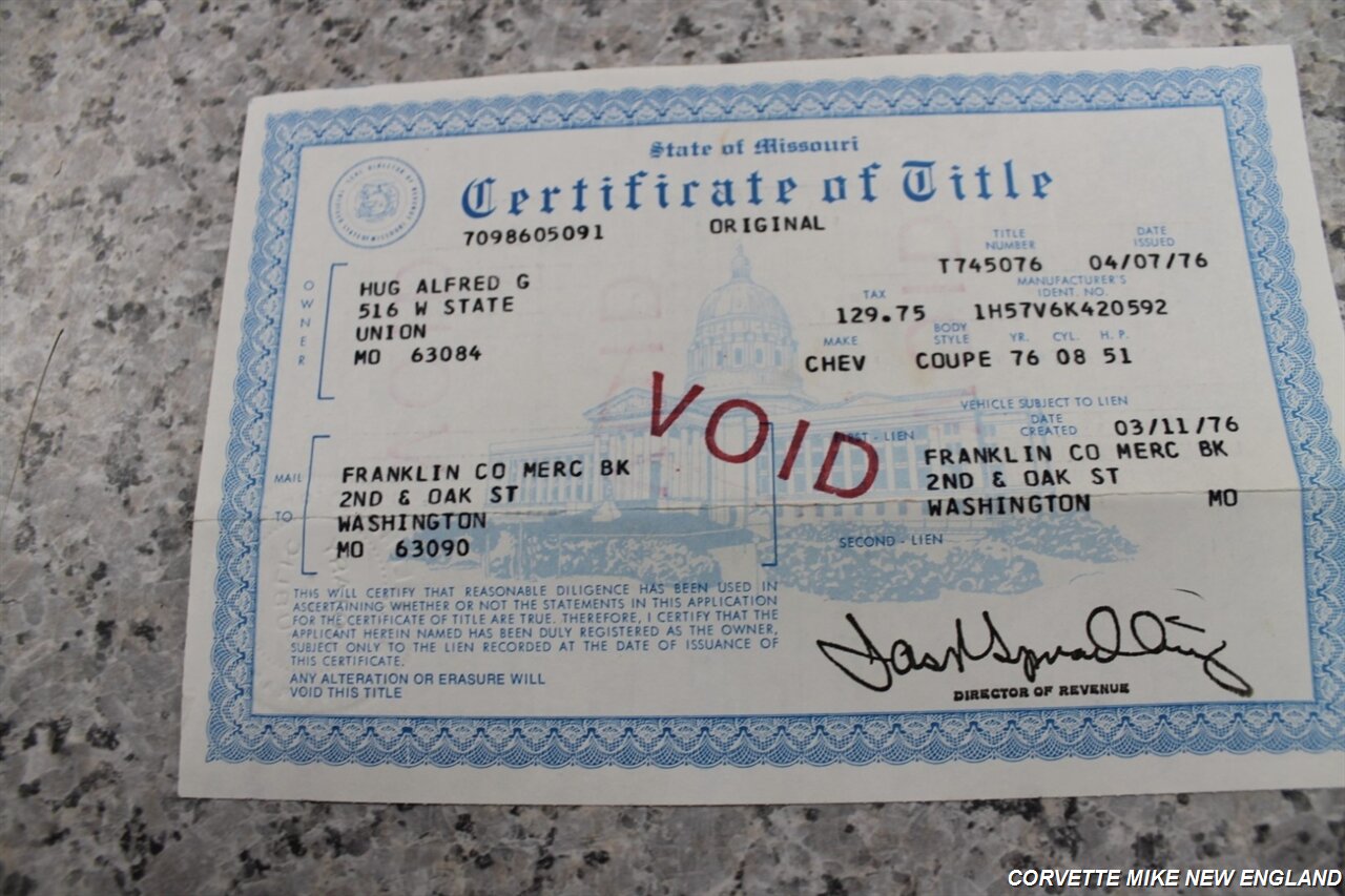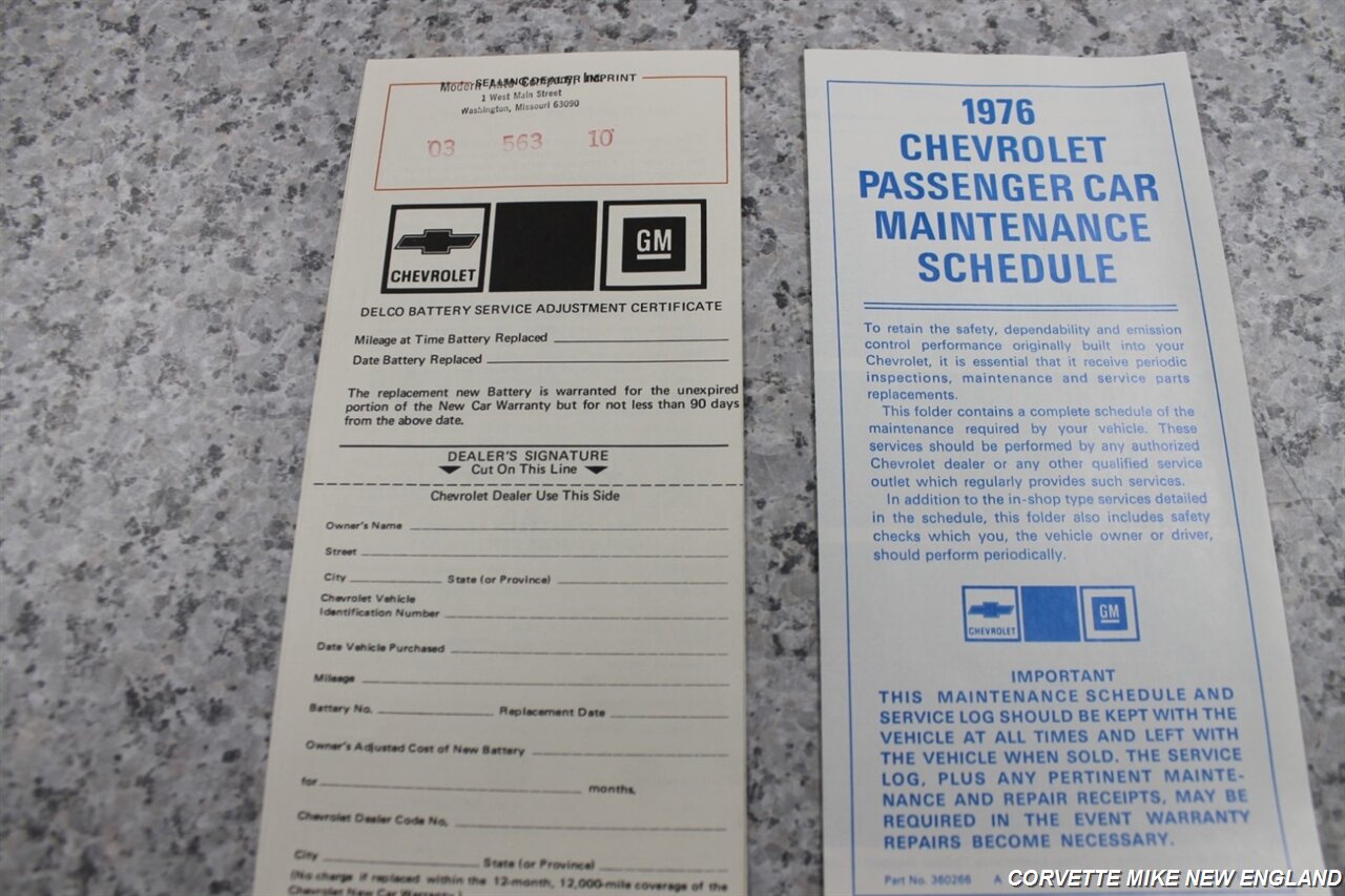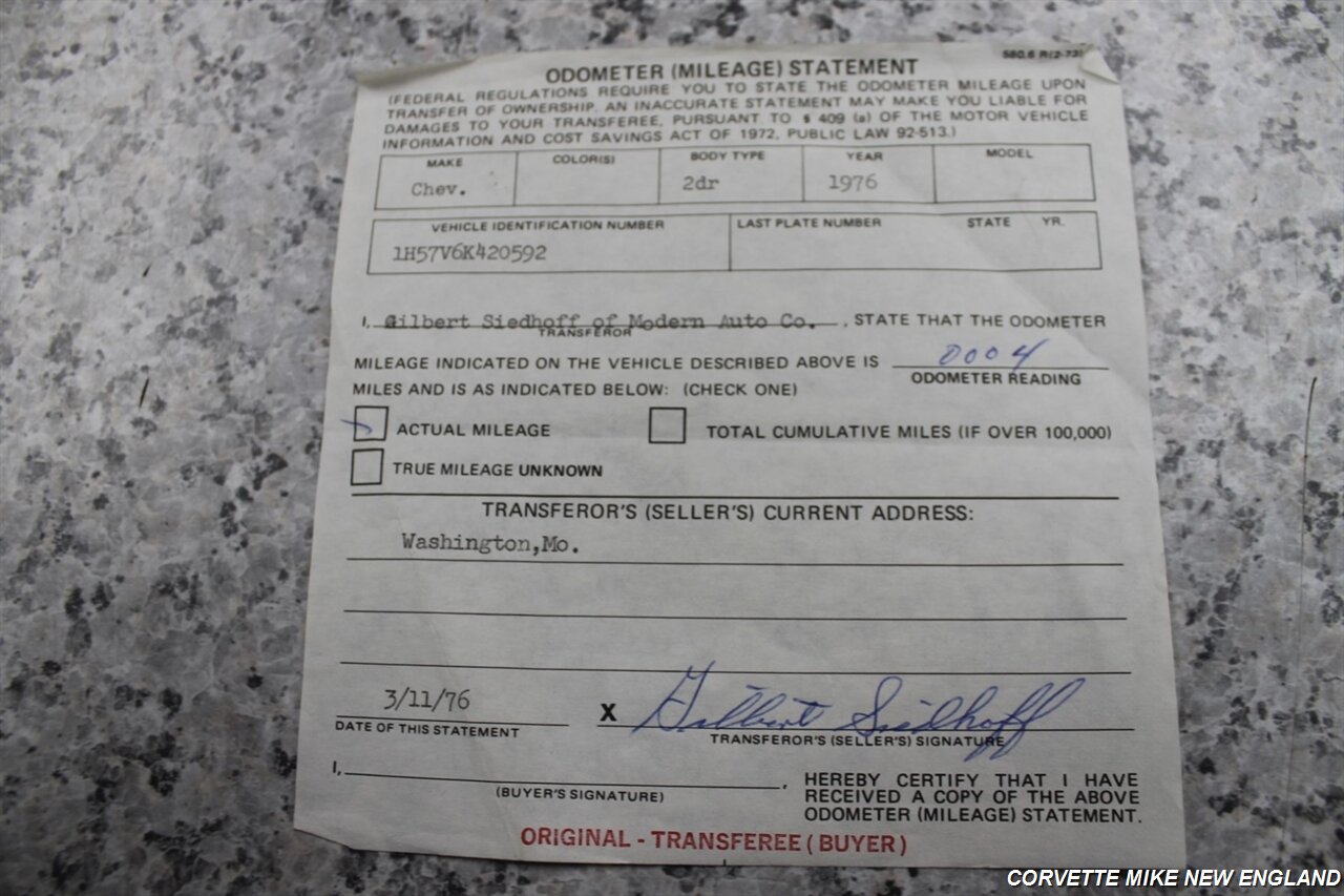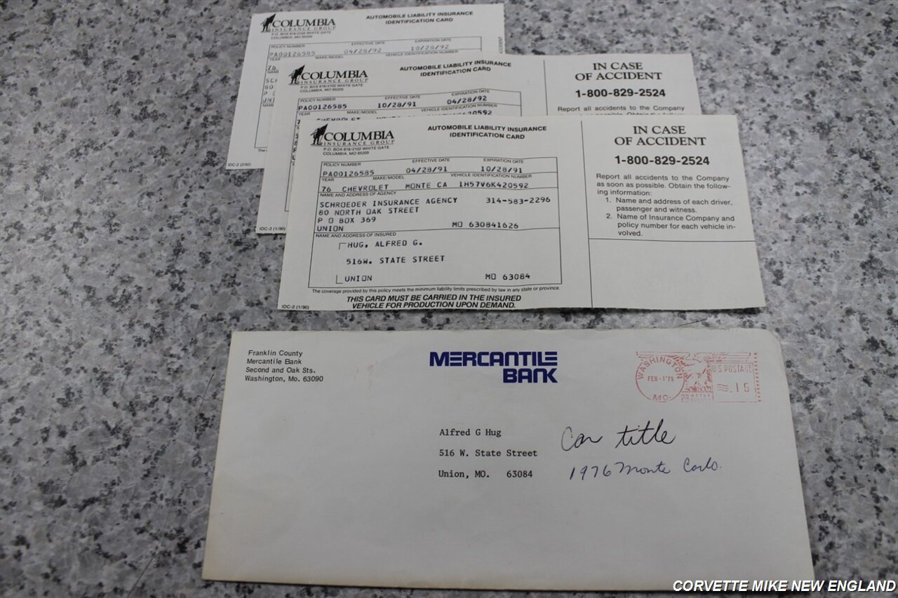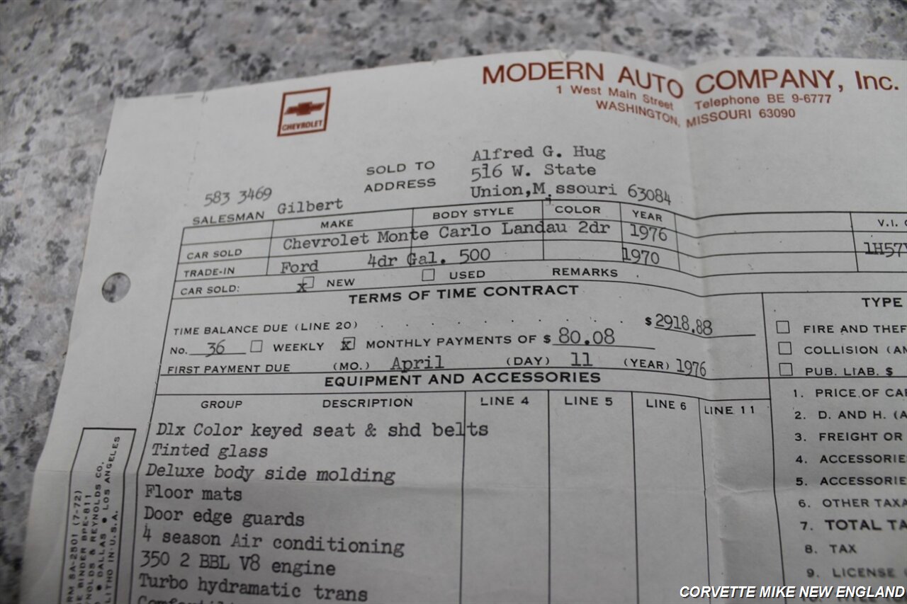 1976 Chevrolet Monte Carlo, Black code 19L with Z03/19T Black vinyl Landau roof and 19E Black knit cloth bench seat, L65 350ci V8 engine with 2-BBL carb, M40 Turbo Hydra-matic transmission, C60 Four-season air conditioning, Variable ration power steering, Power disc/drum brakes, 15x7 wheels w/ white wall tires, Radial tuned suspension, High energy ignition system, N33 Comfortilt steering wheel, UF7 Econominder gauge pkg, U63 AM radion, V30 Bumper guards, ZJ9 Aux. lighting, AK1 Deluxe color keyed seat belts, A01 Soft-Ray tinted glass, BW2 Deluxe body side moldings, B37 color keyed floor mats, BF3 Door edge guards, Sold new at Modern Auto Co Inc in Washington, Missouri with an original MSRP of $6,071.85! Includes amazing amount of GM/ dealer documentation......Call for price!