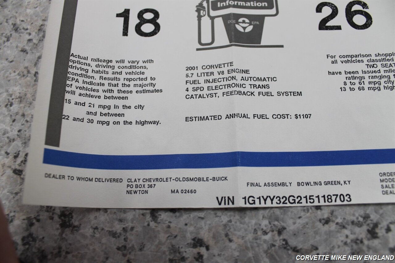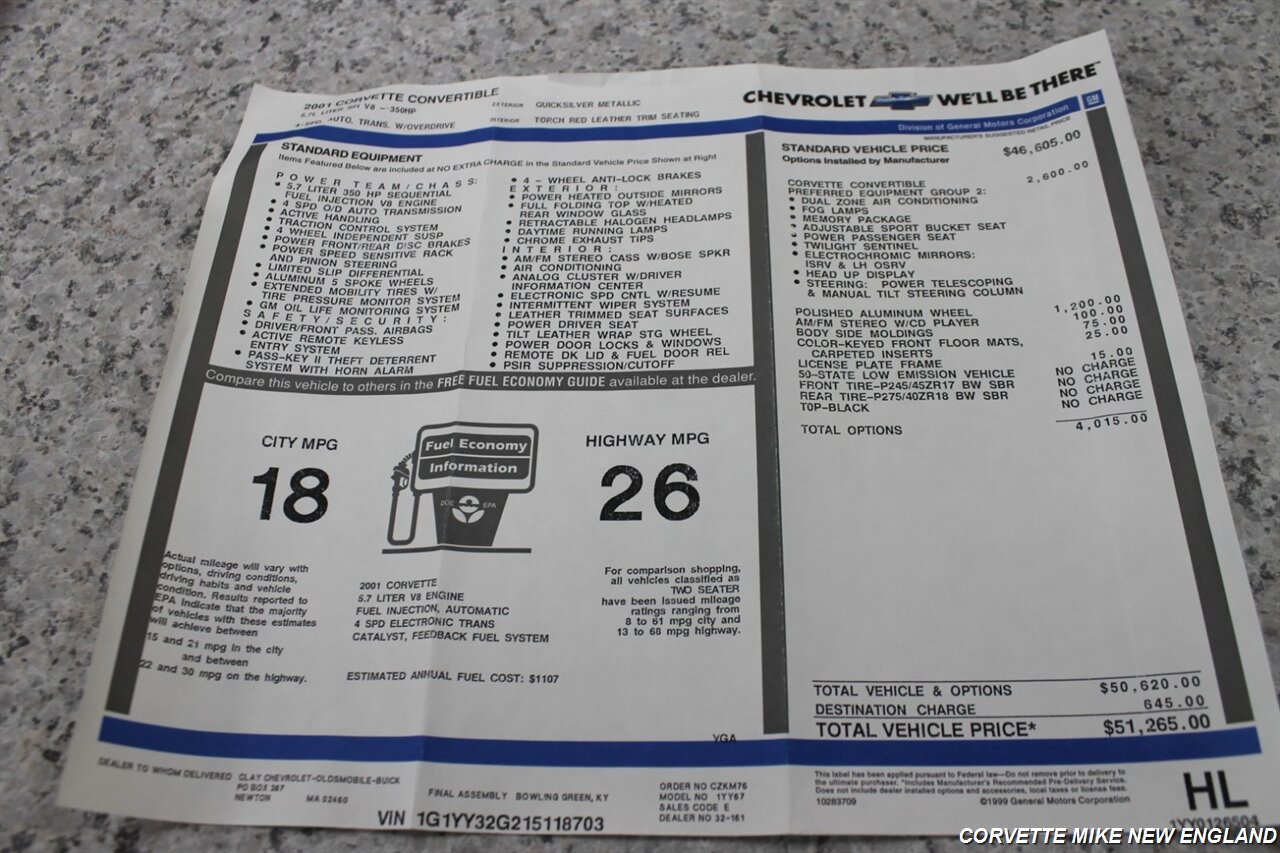 2001 Corvette Convertible, Quicksilver Metallic with Torch Red interior and Black top, 5.7L 350hp LS1 engine, Automatic transmission, Active handling, Polished aluminum wheels w/ brand new tires, Body side moldings,, Dual zone air conditioning, Dual power sport seats, Memory, Power telescopic steering wheel, Head up display, Tilt wheel, Cruise control, Twilight sentinel, Bose stereo with CD, Original owner's manual and window sticker with salesman's card...sold new at Clay Chevrolet in Newton, Ma... Rare One owner C5 with only 28k miles.....$24,900