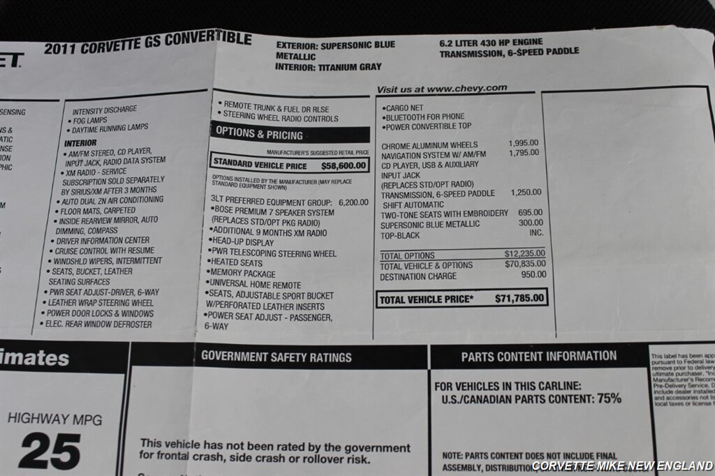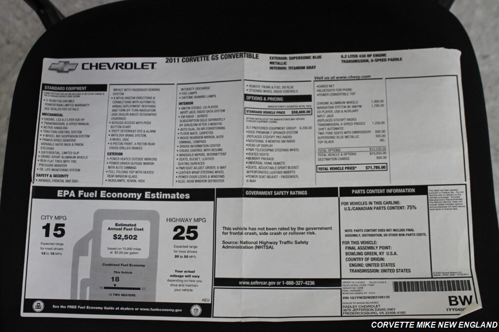 2011 Corvette Grand Sport Convertible, Supersonic Blue Metallic with Titanium Gray/Black two-tone i leather interior, and Black top, 6.2L 430hp LS3 engine, 6-spd paddle shift automatic transmission, Active handling, Chrome wheels with recent tires, Borla exhaust and Corsa cold air intake, 3LT w/ Power convertible top, Head up display, Dual power heated sport seats, Dual zone climate control, Power telescopic steering wheel, Memory, Bose stereo w/ Bluetooth, Navigation, XM, and OnStar, Rare three year only Corvette color with only 240 GS conv's made in 2011.....Only 25k miles..........$42,900