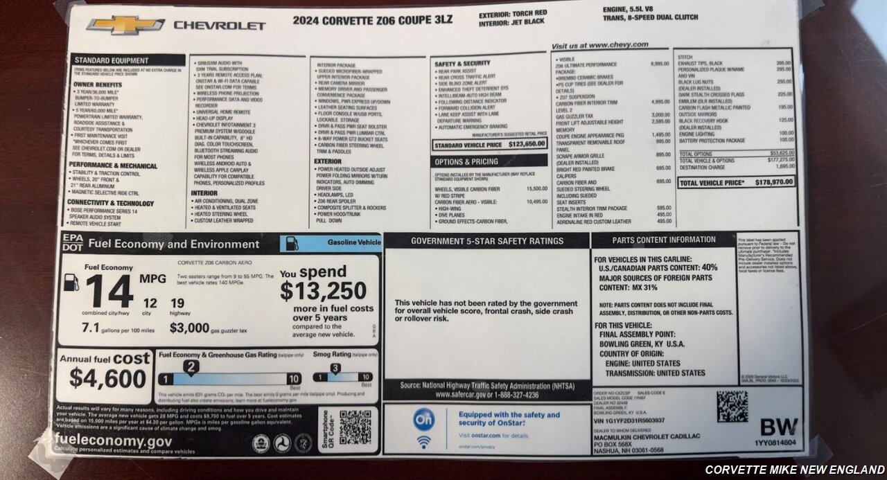 2024 Corvette Z06 Coupe, Torch Red with Adrenaline Red custom leather wrapped interior, LT6 5.5L V8 w/ 670hp, 8-speed dual clutch automatic transmission, Magnetic ride control, Stability and traction control, Z07 Ultimate performance pkg w/ 20" & 21"PS cup tires, Brembo ceramic brakes and Z07 suspension ($8995 option), Visible carbon fiber wheels w/red stripe ( $15,500 option), Visible carbon fiber aero pkg w/ High-wing, Dive plains, and ground effects ($10,495 option), Carbon fiber interior trim ($4995 option), Front lift w/memory, Engine appearance package, Transparent roof, Scrape armor grille, Bright red brake calipers, Carbon fiber and sueded steering wheel w/ inserts, Stealth interior trim pkg, Red engine intake, Black exhaust tips and black lug nuts, Carbon flash mirrors, 3LZ w/ Color head up display, Dual zone climate control, Dual power GT2 bucket heated and ventilated seats, Heated steering wheel and outside mirrors, Power tilt/tele steering wheel, Chevrolet/Bose infotainment system w/ Sirius/XM, Bluetooth, OnStar, Navigation and performance data recorder, Backup and front curb view cameras, Forward collision and blind spot alerts and more, One of the highest option ordered Z06's ordered in 2024 with a MSRP of $178,970